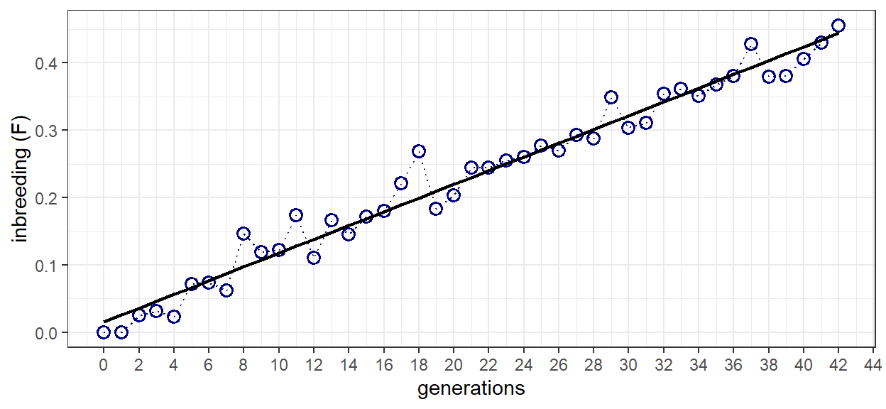 Because this is a simulation, variance exists in the calculated inbreeding from generation-to-generation. To compensate for this variation, a linear model in the form of F = b + mt is fit to the data. A plot of inbreeding as a function of time is then produced so the results can be examined. After 42 generations, inbreeding reaches a level of just over 0.4. This equates well to the theoretical value of 0.410 reported in the example problem.