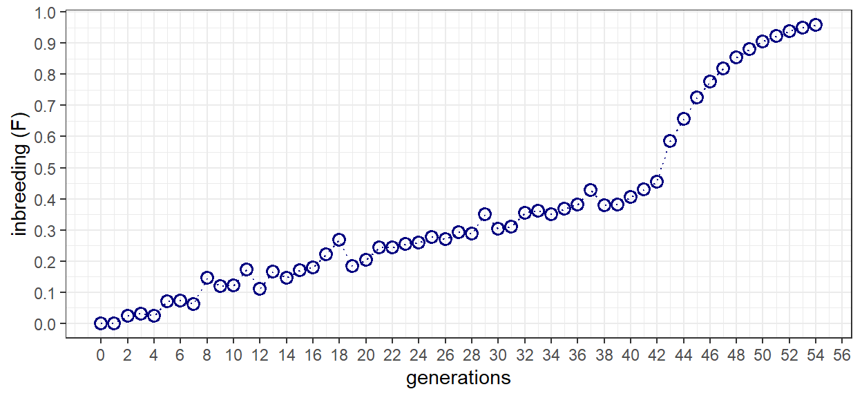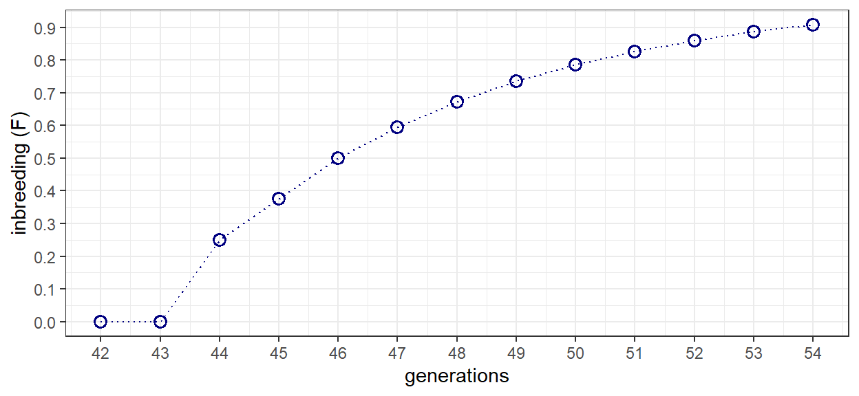 The same basic processes are applied to generations 42 to 54 that represent the progression from B-to-X. The only difference between the scripts are a few lines of code to revert the filtered pedigree IDs to start from 1. After 11 generations of full-sib mating, inbreeding reaches a level equal to 0.908. This is equivalent to the theoretical value given in the example problem, and in table 5.1.