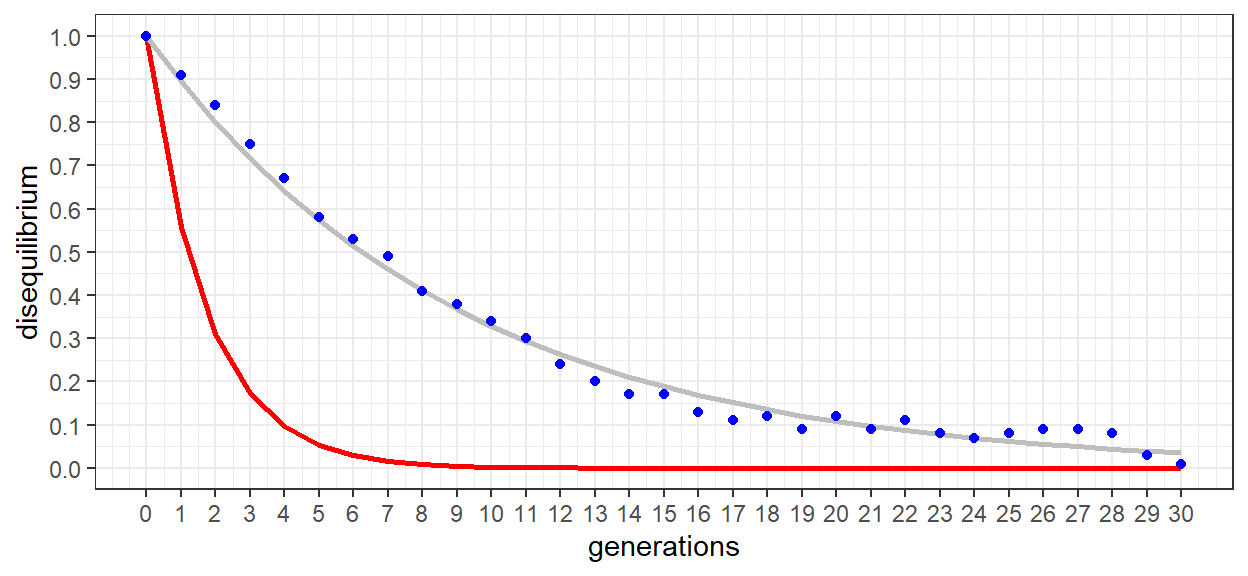 The graphic more clearly illustrates the more gradual reduction in disequilibrium. As a reference, the un-linked model (c = 0.5) was included in the plot. Rather than reaching equilibrium in 5-6 generations, upwards of 25+ generations were required for loci 2 and 3. Linkage between the two loci is clearly present.