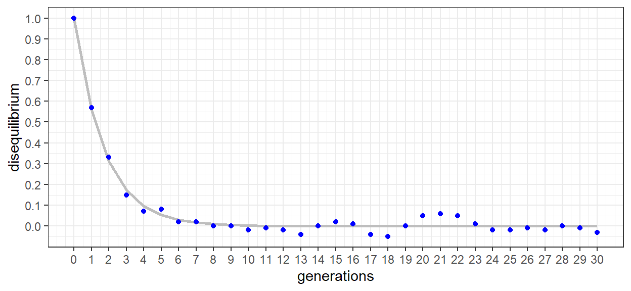 The plot of disequilibrium as a function of generation looks very similar to the c = 0.5 series of figure 1.3 in the text. When presented as Dmax, disequilibrium is 1 in generation 0 and then declines sharply. After 5-6 generations equilibrium has been reached and Dmax oscillates around 0. The slight oscillation is error as a result of the data being determined from simulated genomes and populations. The error can actually be increased/decreased through increases/decreases to the population size. This, however, is a topic of importance for later chapters.